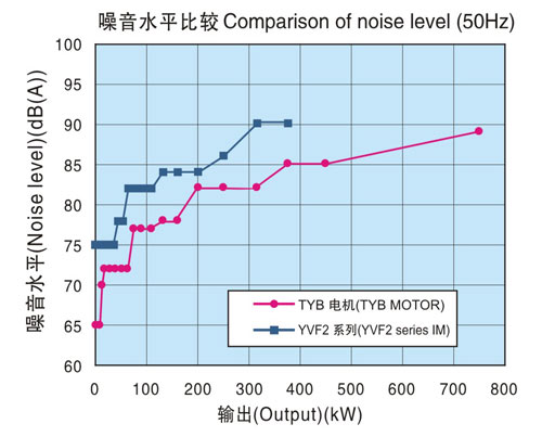 通過降低電機(jī)總損失,減少電機(jī)冷卻風(fēng)量,實(shí)現(xiàn)了比本公司YVF2系列變頻器專用IM更低噪音化。