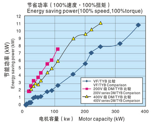 下圖是通過(TYB電機(jī)++INV)組合下的綜合效率與(感應(yīng)電機(jī)(IM)+INV)、(直流電機(jī)(DM)+直流驅(qū)動(dòng)裝置)的綜合效率之差來表示節(jié)省功率的。