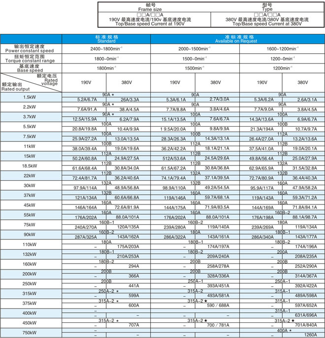 注1) 315kW 375kW 450kW以及750kW中,*標(biāo)記只表示恒轉(zhuǎn)矩控制。但是,如果容A從750kW降低到700kW,則可適用于電機(jī)轉(zhuǎn)速范圍1500~1200min-1。 (700kW 1500/1200 min-1 1101/1170A)